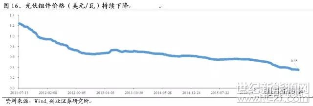 根据2016年底公布的光伏标杆上网电价调整政策,I、II、III类资源区2017年新建的光伏电站标杆电价分别确定为0.65/0.75/0.85元/度,在2016年的标杆上网电价的基础上进一步大幅降低。标杆电价的持续下调是大势所趋,2020年实现平价上网是政策和产业的共同追求。补贴的下降会对光伏企业的盈利能力形成压力,从而倒逼光伏企业降低其发电成本,进而通过市场的优胜劣汰筛选出优质的公司。