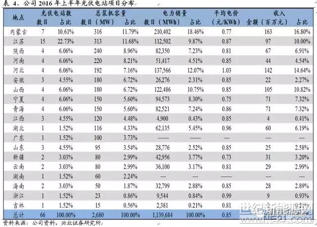 并网容量快速增加,项目布局具备区域优势,核心竞争力提升。截止2016年上半年,公司在全国拥有光伏电站68家,装机容量达到2,680MW,并网容量达到2,127MW,我们预计2016年末并网容量将超过3GW,同时预测公司未来2-3年每年将新增加并网约1.5GW。快速提升的并网容量将驱动发电量和发电收入快速增长。公司的光伏电站具备区域优势,较好地避开了弃光限电较严重的省份,重点布局中东部地区,极大提高了公司的电站利用小时数(1H2016:775,2016E:1,260)。