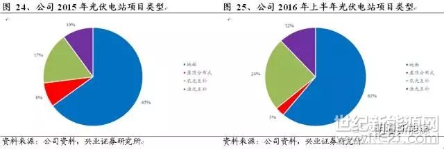 公司在大力布局地面式光伏电站的同时,也积极发展分布式光伏以及农光互补项目和渔光互补项目,积极打造形式多样的电站项目。2016年上半年,公司的电站项目形式仍然以地面式光伏为主,比例为61%,但较2015年小幅下降4个百分点。农光互补和渔光互补项目比例则在2016年上半年上升明显,分别达24%和12%,较2015年分别上升7个和2个百分点(2015年农光互补和渔光互补分别占比17%和10%);两者合计比重为36%,在公司项目中已经占据重要地位。屋顶分布式光伏项目在2016年上半年所占比重则下降较为明显,仅为3%,较2015年下降5个百分点。