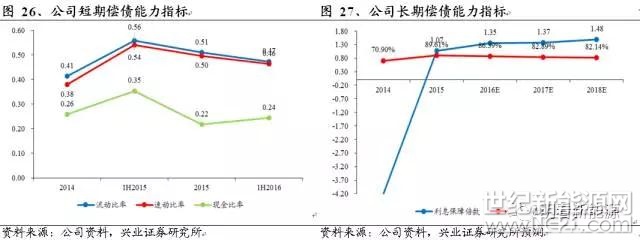 公司2016年上半年流动比率和速动比率分别为0.47和0.46,较2015年全年有所下降(2015年:0.51和0.50)。从现金比率来看,公司2016年上半年较2015年则有微小上升,但仍低于2014年水平(2014年:0.26;2015年:0.22;2016年上半年:0.24)。公司流动比率低于2,而速动比率低于1,短期偿债能力压力较大。因此,虽然公司收入和利润增长迅猛,但缺乏对应现金流的支撑,可能会使公司短期内面临资金周转的压力。
