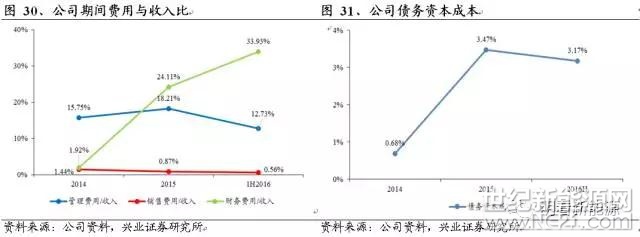 (2)公司2016年上半年管理费用与收入之比为12.73%,较2015年全年下降约5.5个百分点(2015年:18.21%)。随着公司光伏电站业务比重逐渐增大,管理团队逐渐趋于精英化,管理人员数量的增加幅度低于公司营业收入的增长。2016年公司销售费用占收入比重为0.56%,较2015年全年出现微幅下调(2015年:0.87%)。这是由于得益于协鑫新能源的品牌效应和光伏电站业务的主导地位越发巩固,营销开支的需求会逐渐减少。印刷线路板业务的剥离也将进一步降低公司的销售费用率。另外,由于公司融资需求的急剧增加,财务费用(此处财务费用既包含费用化利息,也包含资本化利息)占比则上升明显,在2016年上半年达到33.93%,延续了2015年该指标的上升势头(2014年:1.92%;2015年:24.11%)。与此相反,2016年上半年,公司的债务资本成本为3.17%,较2015年则略有下降(2015年:3.47%)。