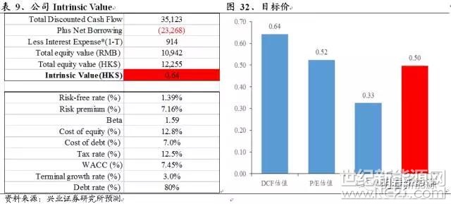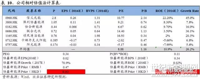 我们选取联合光伏(0686.HK)、顺风清洁能源(1165.HK)、保利协新能源(3800.HK)、协合新能源(0182.HK)、信义光能(0968.HK)、卡姆丹克太阳能(0712.HK)和阳光能源(0757.HK)等7家在香港上市的光伏行业里的代表性公司,并剔除我们认为可比性不大的公司,采用修正平均市盈率和修正平均市净率的方法对协鑫新能源进行估值。两种方法的估值结果分别为0.52港元和0.33港元。两种估值方法的结果存在较大差距。