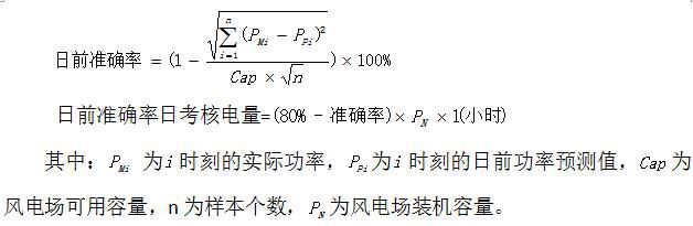 2)电力调度机构对风电场次日0-24h日前功率预测准确率进行考核。准确率应大于等于80%,小于80%时按以下公式考核: