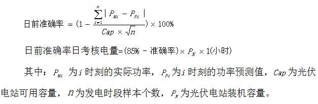 4)电力调度机构对光伏电站次日0-24小时日前功率预测准确率进行考核。准确率应大于或等于85%,小于85%时按以下公式考核: