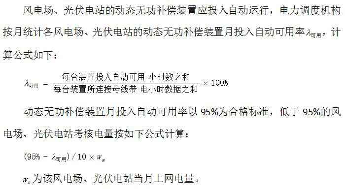 (二)风电场、光伏电站所配置的动态无功补偿装置性能(包括容量配置和调节速率)应满足相关技术标准的要求,不满足要求的风电场、光伏电站应完成整改,在整改前每月按照全场站当月上网电量的2%考核。