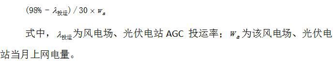 AGC投运率以98%为合格标准,全月AGC投运率低于98%的风电场、光伏电站考核电量按如下公式计算: