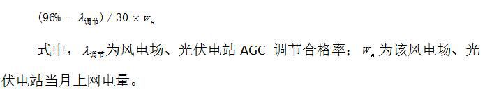 AGC调节合格率以96%为合格标准,全月AGC调节合格率低于96%的风电场、光伏电站考核电量按如下公式计算: