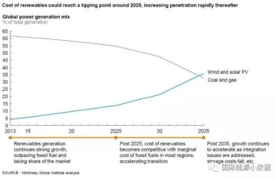 索比光伏网讯:风电、光伏何时真正可以煤电、气电竞争?知名咨询公司麦肯锡预测,2025年将是风电光伏与煤电、燃气发电竞争的转折点,届时风电、光伏成本将在全球范围内低于煤电、气电成本。到2035年,风电、光伏在总发电量的比例将在全球范围内超过煤电、燃气发电的比例。