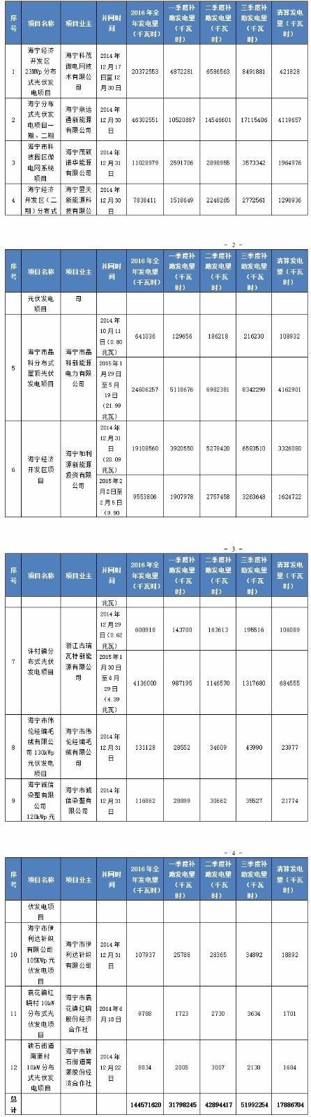 附件:海宁市2016年度电价补助资金清算发电量(2014年度分布式光伏发电项目)