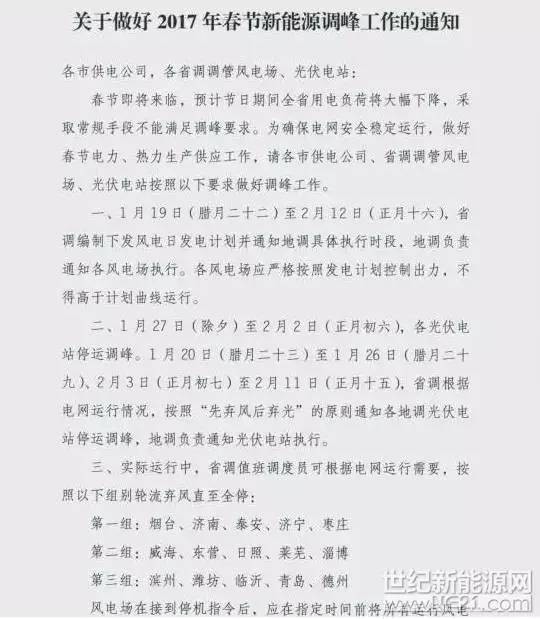 2017年1月10日,山东省经信委、能源监管办、电力调度中心联合发文《关于做好2017年春节新能源调峰工作的通知》。由于春节期间电力负荷下降,该文件对山东省内的新能源调度提出要求。其中: