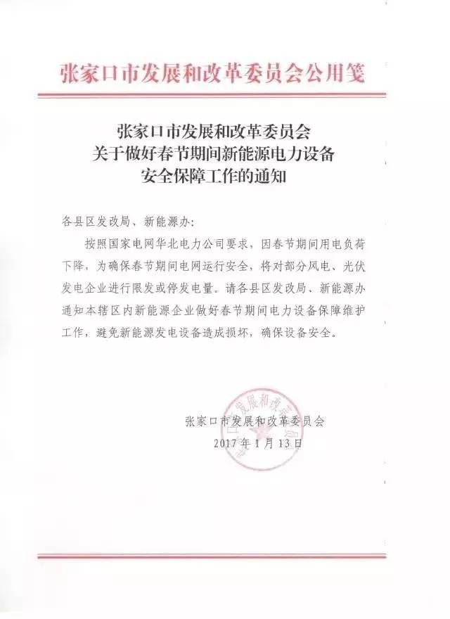 按照国家电网华北电力公司要求,因春节期间用电负荷下降,为确保春节期间电网安全运行,将对部分风电、光伏发电企业进行限发或停发电量,要求各县区发改局、新能源办通知辖区企业做好春节期间电力设备保障维护工作。