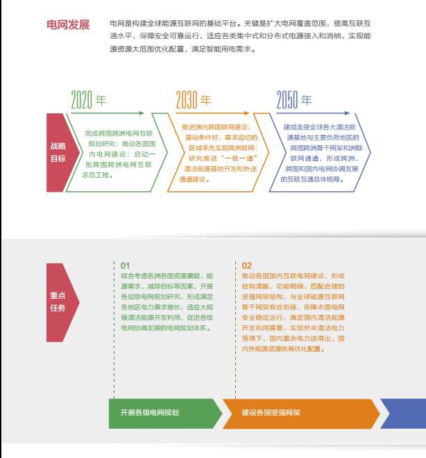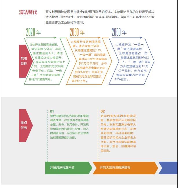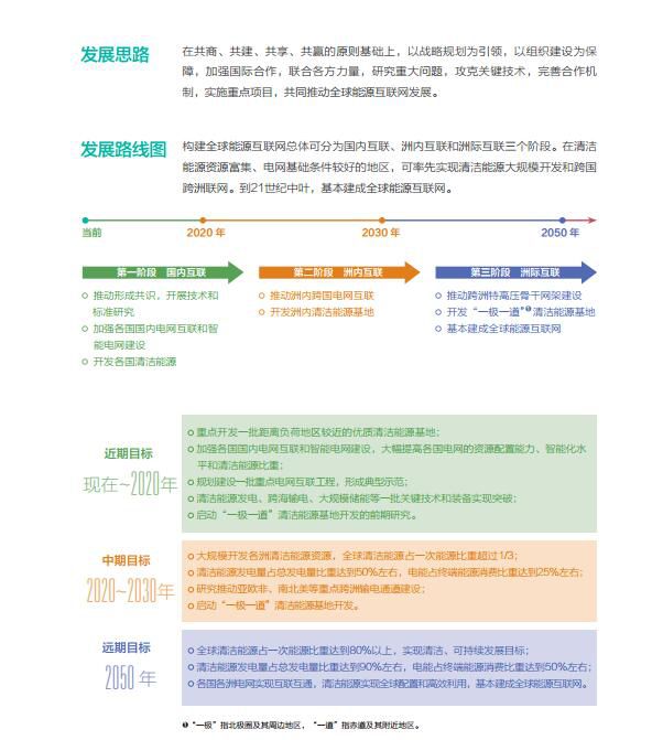 从现在到2020年:加快开发各国清洁能源,清洁能源占全球一次能源比重达到1/4;清洁能源经济性大幅提升,风电实现发电侧平价上网,太阳能发电实现用电侧平价上网。启动“一极一道”及各洲清洁能源基地开发前期研究。