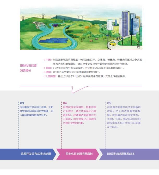 限制化石能源消费增长:各国积极采取措施,限制煤电产业增长,减少或取消化石能源补贴,鼓励清洁能源替代化石能源。加快提高化石能源作为原料使用的比重。