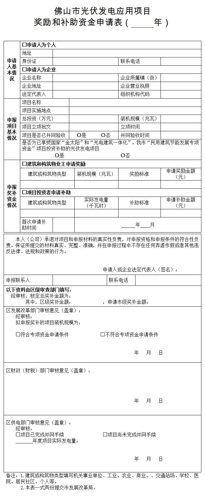 (1)《佛山市光伏发电应用项目奖励和补助资金申请表(__年)》(见附件2);