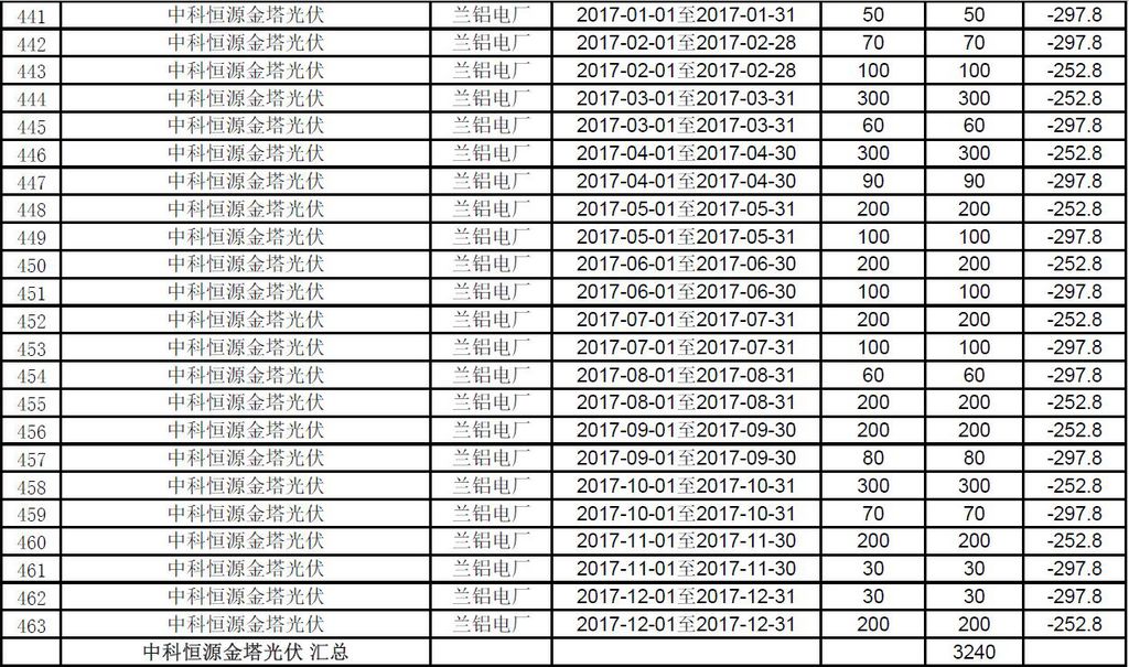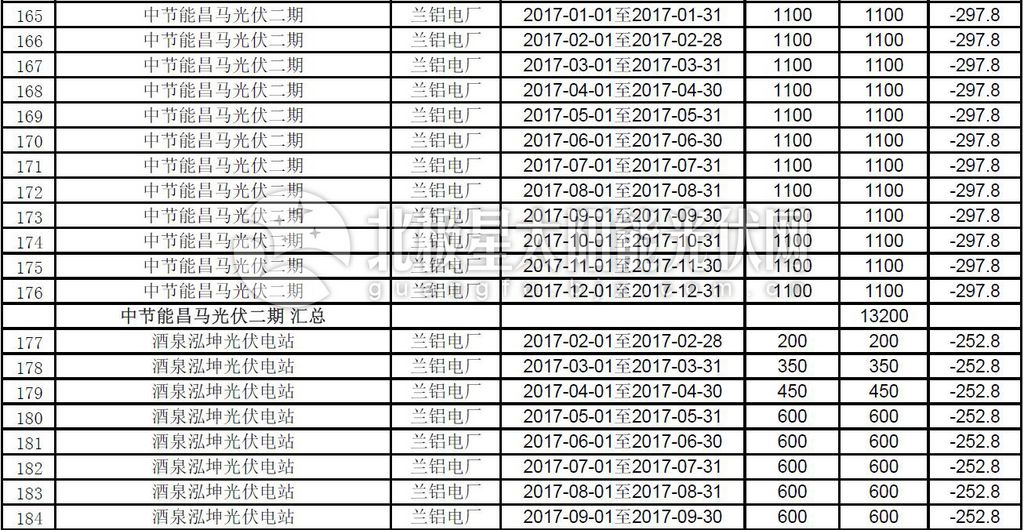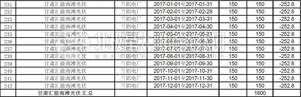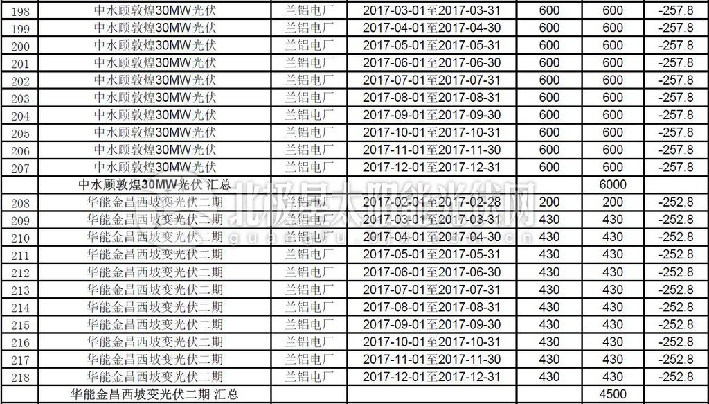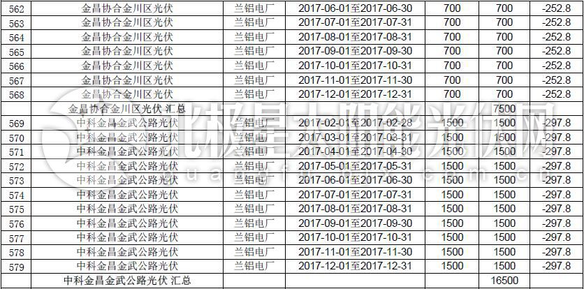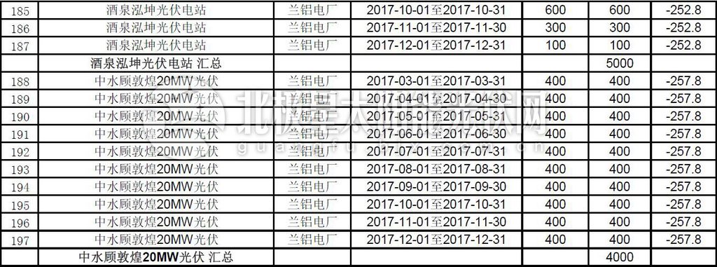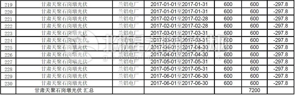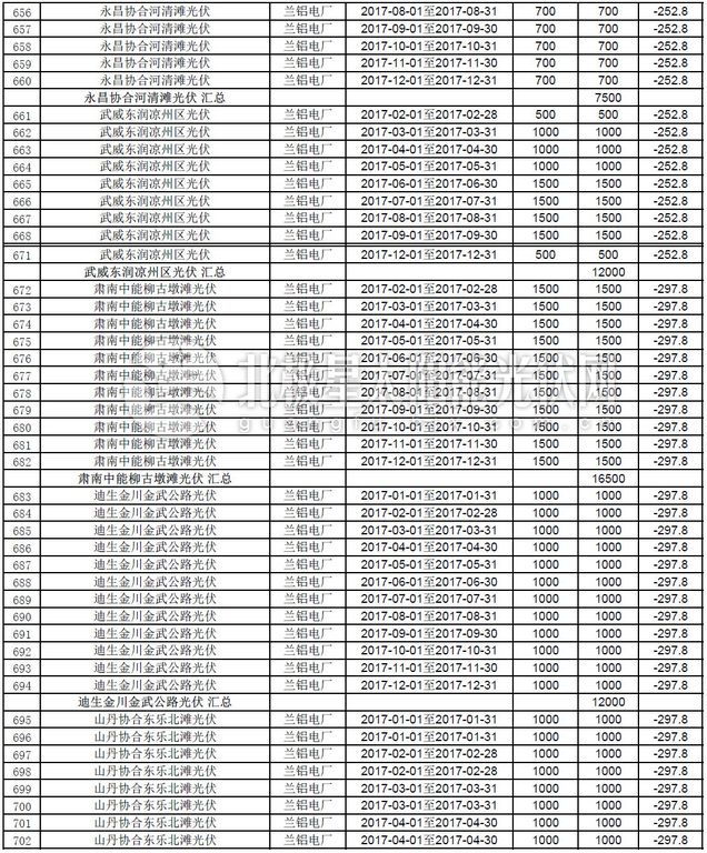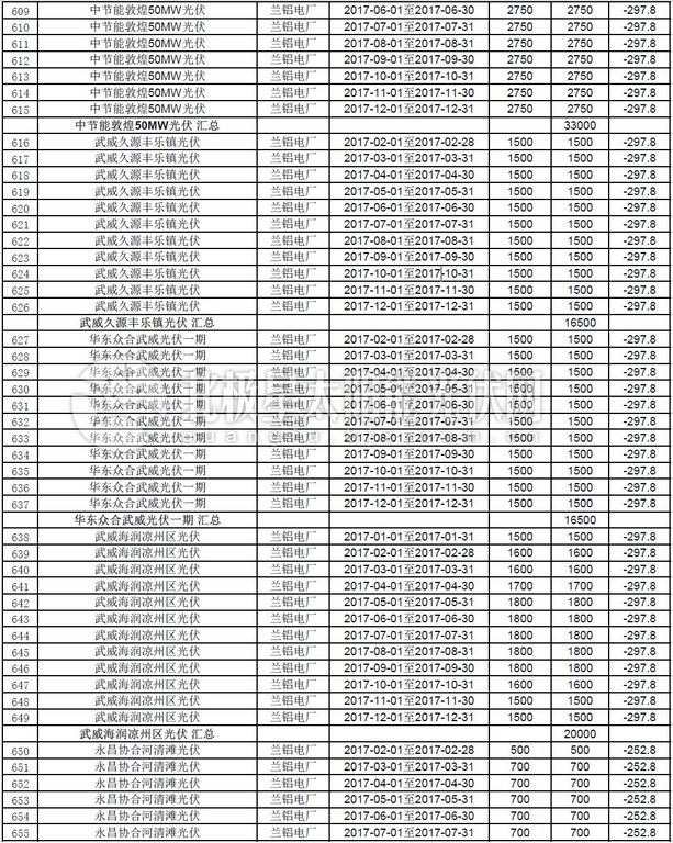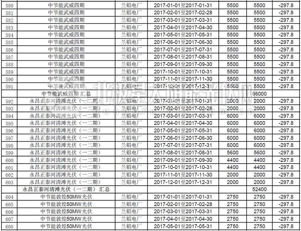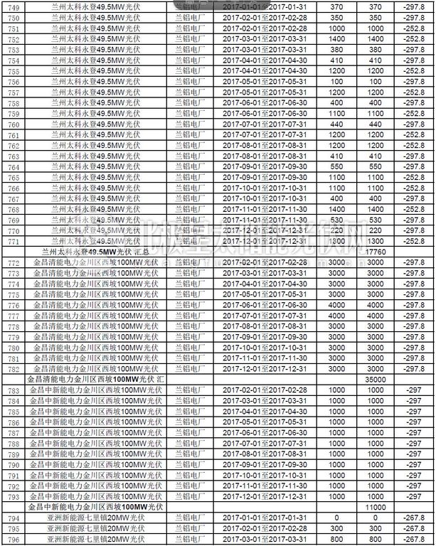 近日,2017年甘肃省新能源发电企业与中国铝业兰州分公司自备电厂电量置换交易结果出炉,本次交易以双边/集中撮合方式成交,新能源发电企业申报电量17.0992亿千瓦时,经调度安全校核后,共成交电量16.8874亿千瓦时。其中,含光伏企业100家左右,成交电价有0、-222.8、-230.3、-236.9、-237.8、-252.8、-257.8、-267.8、-280、-297、-297.8元/千千瓦时。