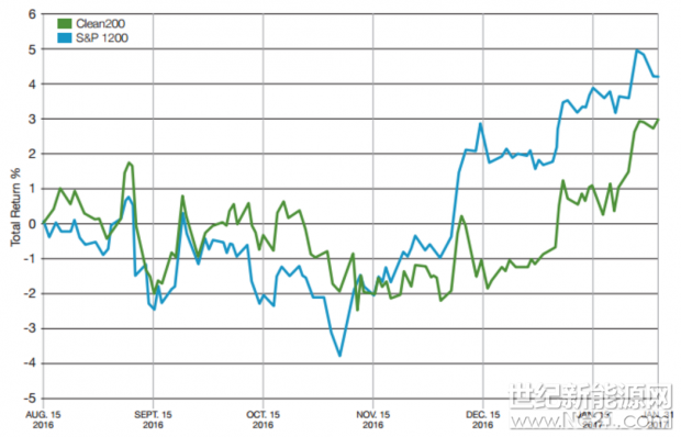 横向:时间 纵向:回报率百分比 绿色线:绿色企业200强 蓝色线:标普1200强
