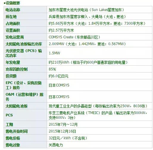 投资额约为6亿日元,以32日元/kWh(不含税)的收购价格向关西电力售电。对于发电功率,要求功率因数控制达到最大限度,即85%。