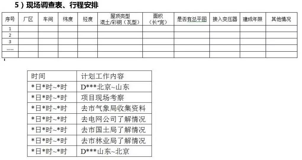 考察前,需要准备一些文字性资料。比如分布式现场考察前需要准备一些表格,详细记录屋顶的所有方,经纬度,形式,面积等等,已被返回后详细整理。