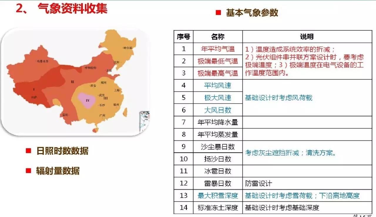 气象资料,除了日照时数与辐射量数据外,还要收集基本气象参数,比如温度、风速、降水量、扬沙天数、积雪深度、冻土深度等,都会可以作为将来的设计参考。