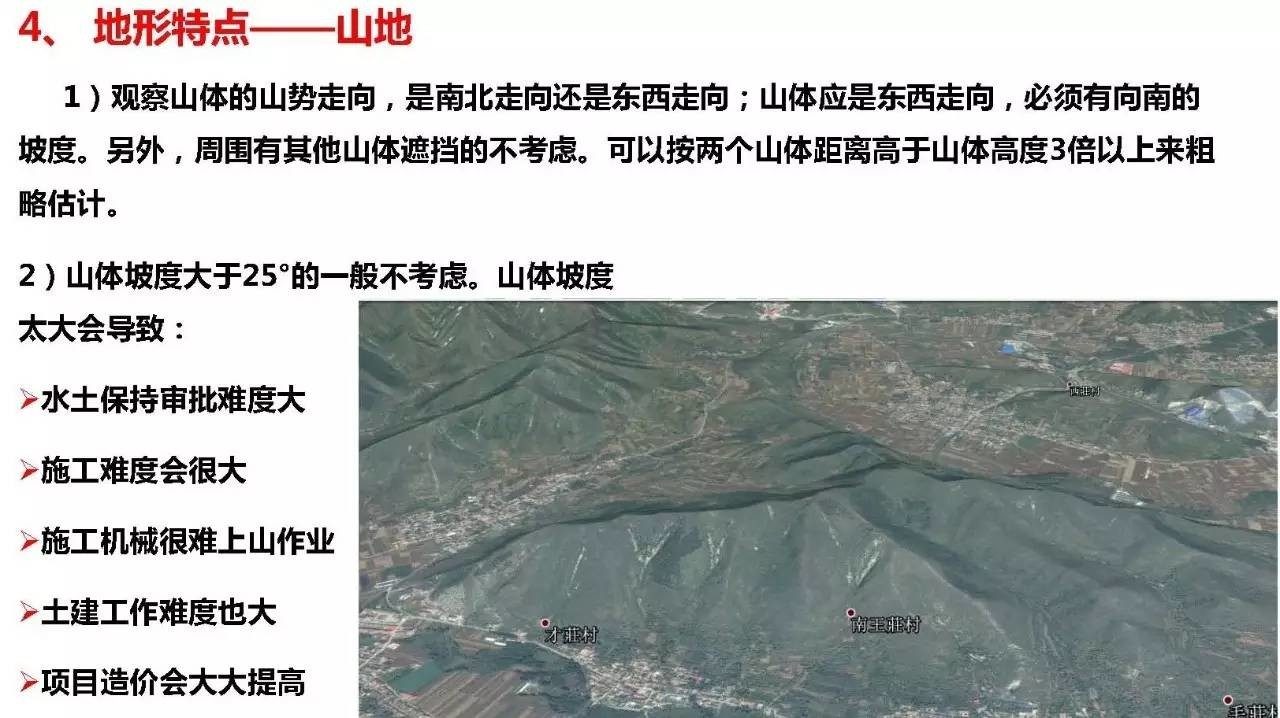 现在平坦的厂址越来越少,如果是山地电站,需要考察山地的走向。最好是东西走向的,有向南的坡面,这样才能保证发电量,还要考察是否有遮挡,纬度较高地方影子倍率大概是三倍,可以利用这个倍率做一个粗略估计。同时,山地最大坡度不要大于40度,太大坡度不利于水土保持,光伏项目土方量还是很大的,会造成比较大的水土破坏。坡度大也会造成施工难度大,造价也会更高,清洗也不方便。