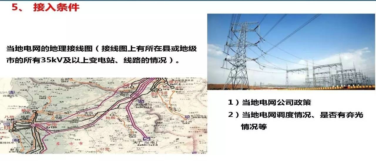 电网接入情况,要拿到当地电网的地理期限图,标注有县级地级市以上35KV变电站的情况,判断电站接入哪个变电站。了解当地电网公司的地方性特殊规定,当地是不是有弃光情况。