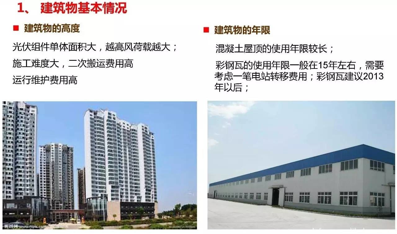 另外需要考察一下建筑的高度。光伏组件的迎风阻力较大,建筑物越高,风载荷越大,施工难度也会随着建筑物高度增大而增大,而且还会涉及一些二次搬运的费用,并要考察是否有二次搬运的空间。还要看一下建筑物的年限,混凝土年限会较长,但是彩钢瓦的年限都在十五年左右,要考虑电站的转移费用,建议选择2013年以后投入使用的彩钢瓦屋顶。