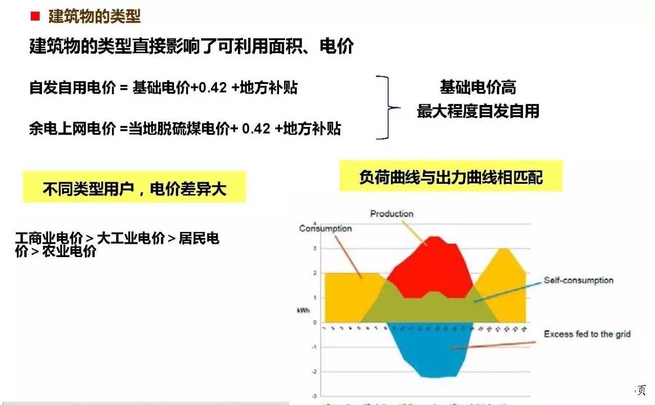 分布式发电项目分为两种,分别是自发自用余电上网和全部上网两种模式,全部上网的电价是固定的,而对于自发自用余电上网这种模式来说,建筑的类型和用途对其电价影响是比较大的。