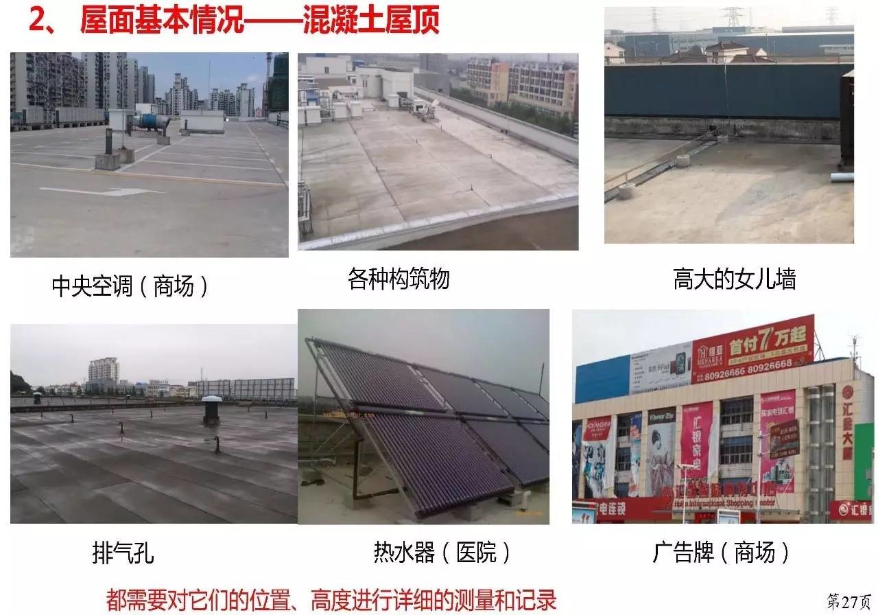 接下来要考察屋面的基本情况,混凝土屋顶上一般会有中央空调或其他小的构筑物,另外需要测量女儿墙,排气孔的高度,有些医院会有太阳能热水器,有些商场还有高大的广告牌,这些都要在我们事先准备好的表格上做记录。