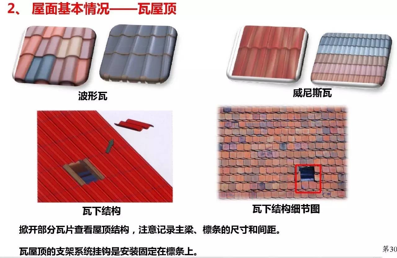 现在户用项目也很多,遇到的主要是瓦型屋顶,我们需要考察用户的瓦型是波浪瓦还是威尼斯型瓦,还要记录内部结构,比如主梁的位置、檩条的位置,方便之后挂钩的安放。