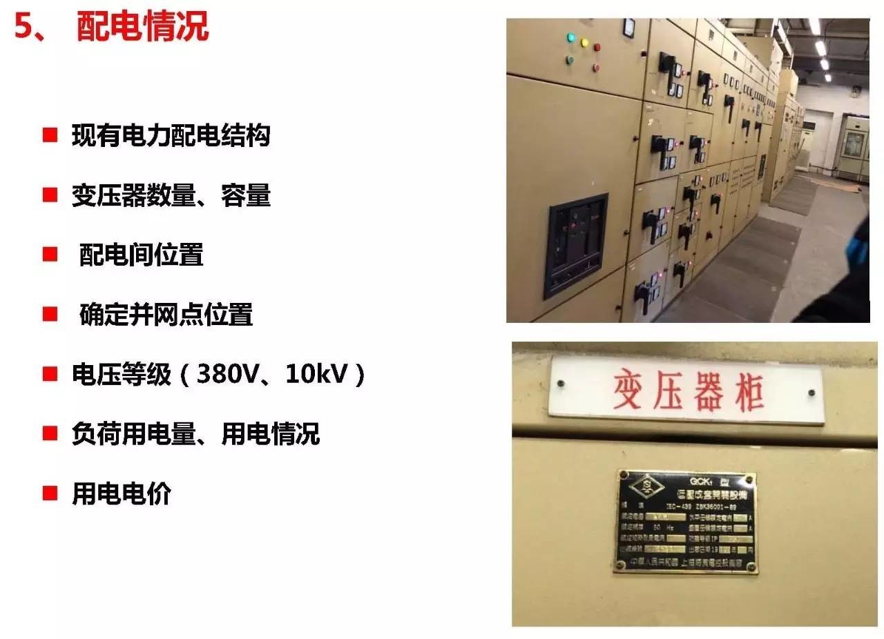地面电站需要考察接入的变电站,分布式项目也要考察接入的配电变电站的情况,比如工厂现有的电力配电结构图,变压器的数量与容量是多少,接入量最好不要超过总量的百分之三十。以及配电站的位置,工厂的负荷情况等等,最重要的是电价是多少。