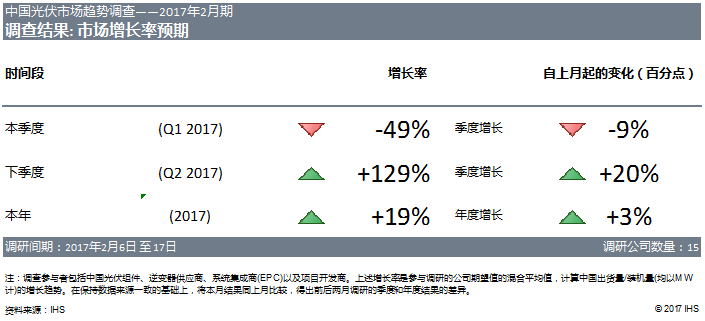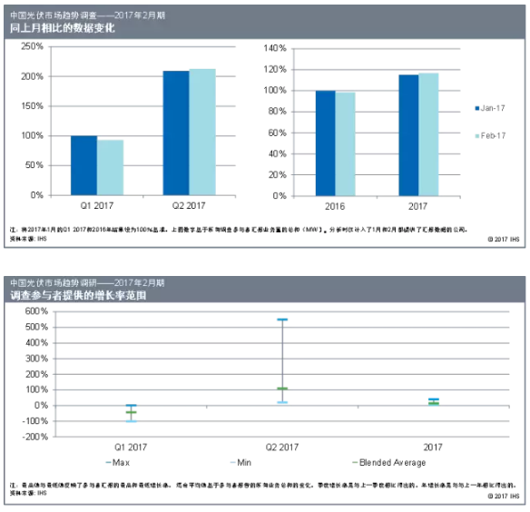 * 尽管政策环境错综复杂,中国光伏供应链依然对2017年的市场充满信心。结果显示大多数参与调研的公司相信,2017年度增长为19%,相比于一月份的调查结果增长了3个百分点。此调研数据显著高于IHS此前对2017年装机量的预估。