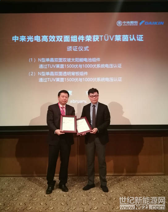值得一提的是,由中来股份全资子公司中来光电创新的两款组件¬¬——N型单晶双面双玻太阳能电池组件与N型单晶双面透明背板组件分别荣获德国莱茵TÜV 授予的1000伏与1500伏系统电压认证证书。会议期间,TÜV莱茵大中华区副总裁邹驰骋为中来光电总经理刘勇颁发了证书,这也是国际权威机构TÜV莱茵全球首次为N型双面组件技术颁发认证。