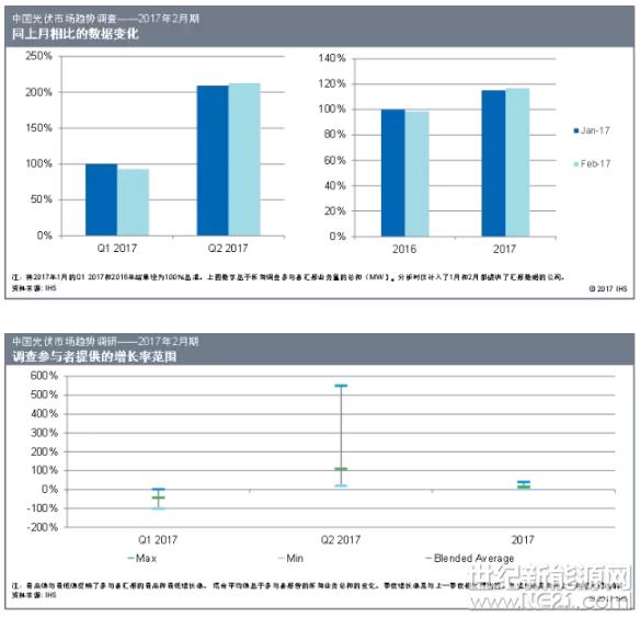 尽管政策环境错综复杂,中国光伏供应链依然对2017年的市场充满信心。结果显示大多数参与调研的公司相信,2017年度增长为19%,相比于一月份的调查结果增长了3个百分点。此调研数据显著高于IHS Markit此前对2017年装机量的预估。