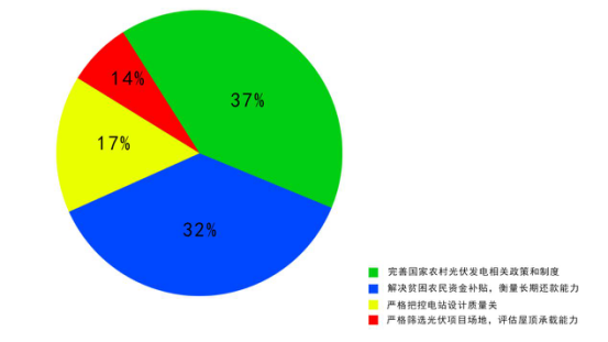 近日,中国电力新闻网、中电传媒微博微信论坛通过微话题征集活动,发布调查问卷,就推进农村光伏发电广泛征集意见。调查结果显示,有17%的受访人群认为,推进农村光伏发电要严格把控电站设计质量关;37%的受访人群认为,需要完善农村光伏发电相关政策和制度;14%受访人群认为,严格筛选光伏项目场地,评估屋顶承载能力;32%受访人群认为,需要解决贫困农民资金补贴,衡量长期还款能力。
