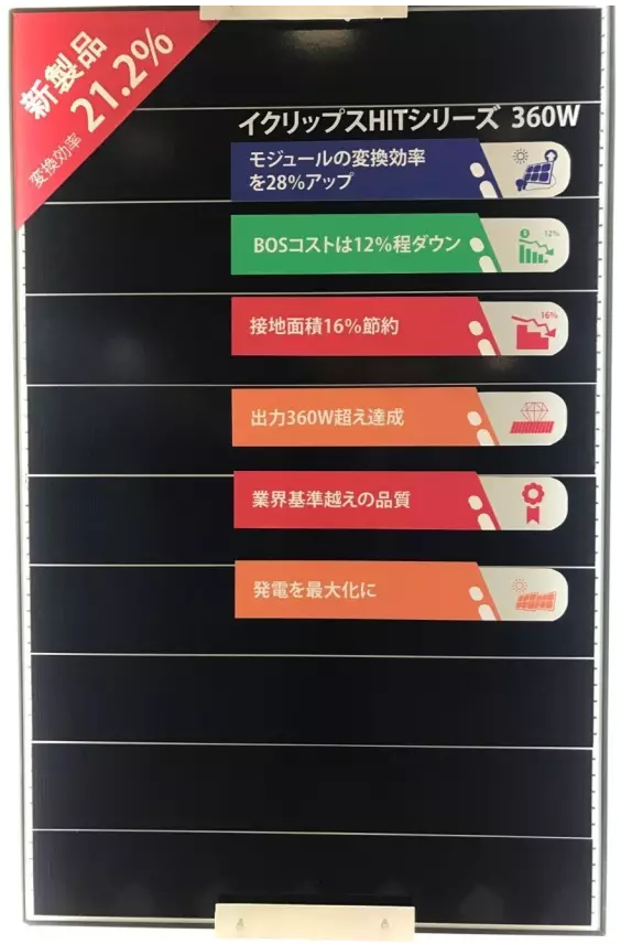 本次重点展出的日食HIT高效组件,组件转换效率高达21.2.%;该组件是将Eclipse创新技术与HIT高效电池相结合,通过优化电池栅线设计和创新的封装技术,有效地增加了组件的受光面积;同时,HIT高效电池片以异质结电池的构造,使光电转换效率大幅提升,而且输出功率的温度特性优秀。