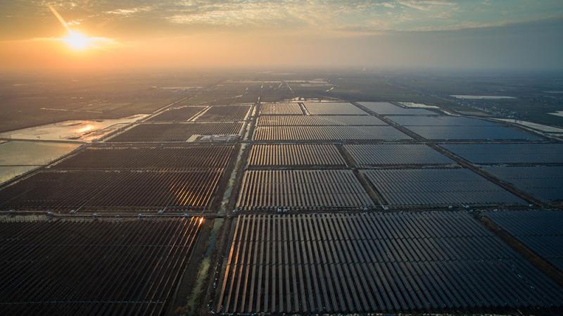 这是2016年12月28日在江苏省扬州市宝应县拍摄的108兆瓦“渔光互补”光伏发电工程。该项目占地约3000亩,在发电的同时仍可进行水产养殖,是当地重要的光伏发电项目。