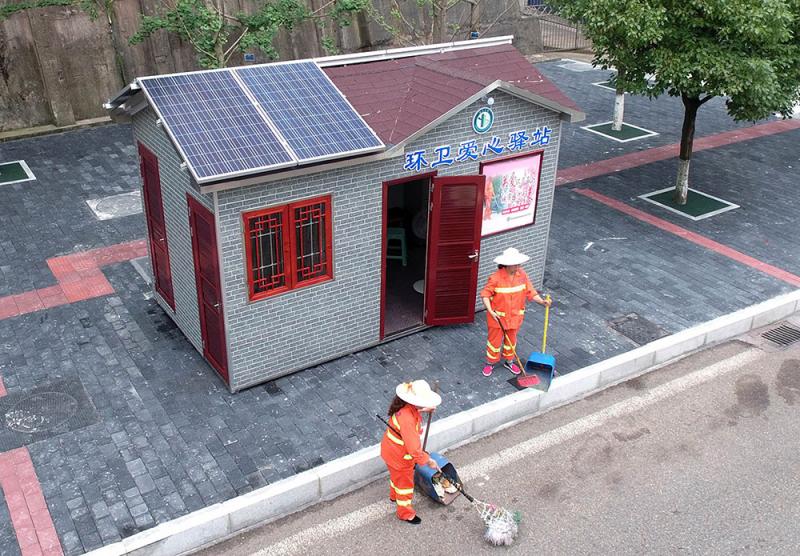 两名环卫工人在重庆首个太阳能环卫爱心驿站外工作(2016年6月13日摄)。该爱心驿站位于重庆市渝北区空港大道,驿站的屋顶上安装了7块光伏发电板,可将太阳能转化成电能,贮存在铅酸蓄电池内,满足环卫工人烧水、热饭等需求。