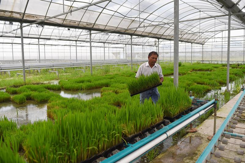杭州市萧山区益农沙地绿色纯品瓜果蔬菜试验场的员工在育秧大棚内将秧盘搬至电动传输设备上(2016年7月14日摄)。大棚顶上太阳能光伏面板产生的电,不仅能够供育秧大棚使用,富余的还可以接入国家电网。