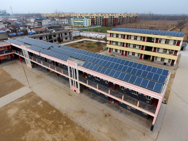 这是2016年12月14日航拍的建设在河南省长垣县常村镇三中教学楼上的光伏扶贫项目。