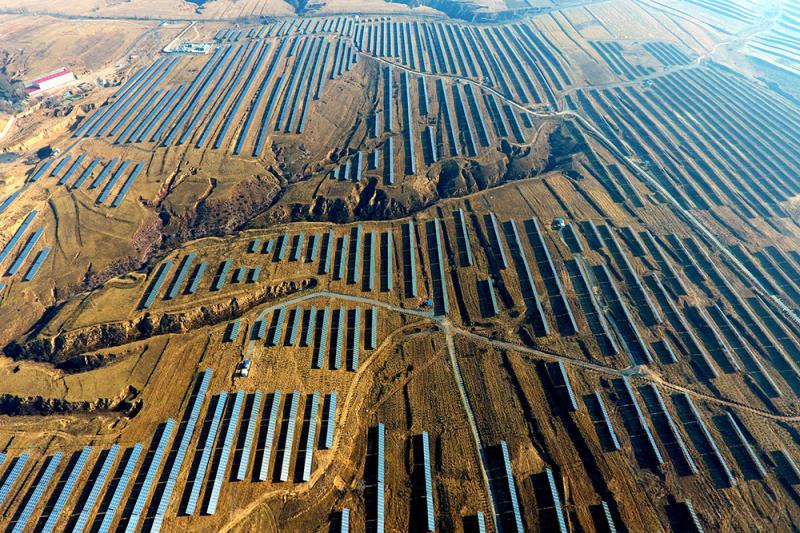 俯瞰山西大同采煤沉陷区光伏示范基地大同京能10万千瓦光伏项目一角(2016年11月16日摄)。近年来,山西省大同市整合采煤沉陷区搬迁后的“废弃土地”等资源,在采煤沉陷区上建设光伏示范基地。