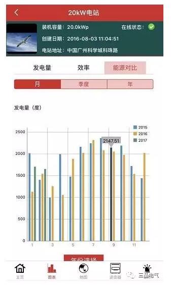 据小编了解,三晶电气开发了晶太阳云监控系统APP正好满足家庭光伏电站的运维需求。逆变器通过GPRS将数据采集到监控数据库,而通过APP实时远程监控整个系统的运行状态。晶太阳云监控系统APP可实现快速扫码注册,优化了用户体验,同时支持电量对比,方便进行发电量的对比分析。更重要的是,支持组串电流监测功能,可快速判断组串运行状况,及时排除组串运行故障。成为广大中小型家用系统集成商方便,快捷的电站监控及运维平台。