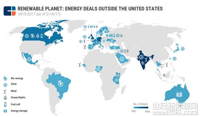 亚洲:自2015以来,印度已成为除美国以外的可再生能源投资交易的第二大国家,占全球交易份额的近8%。印度的太阳能和风能企业共接受了21笔投资,而生物能源方面也有2笔投资。印度现在经营着世界上最大的太阳能发电厂。此外,沙特阿拉伯、台湾和日本的新能源投资主要在太阳能领域,新加坡投资于海洋/水力发电的资金,泰国投资风能,以色列则投资风能、海洋能和太阳能。