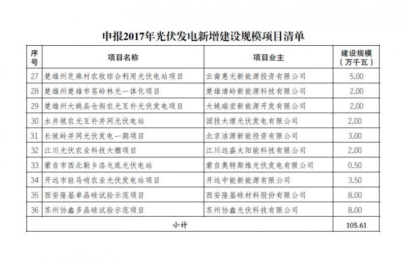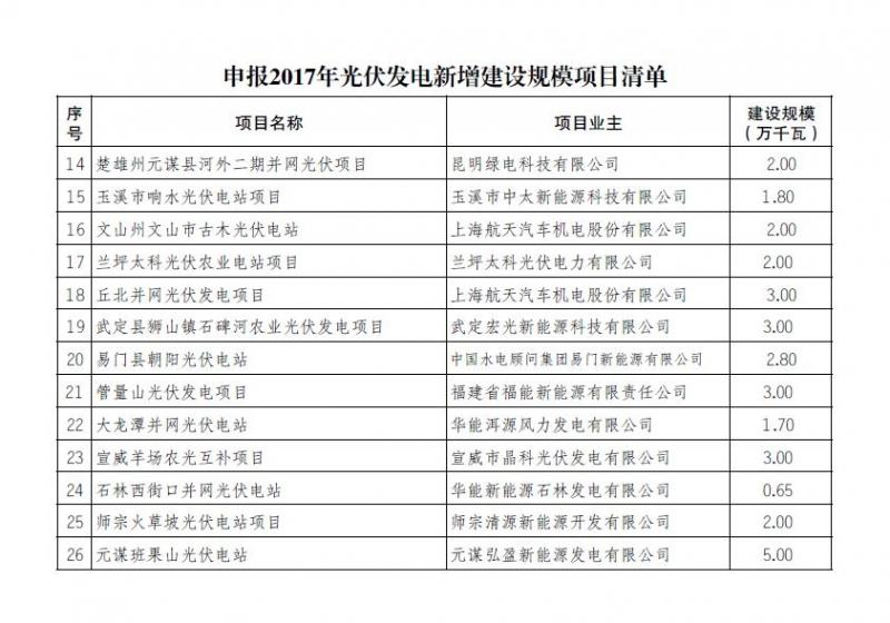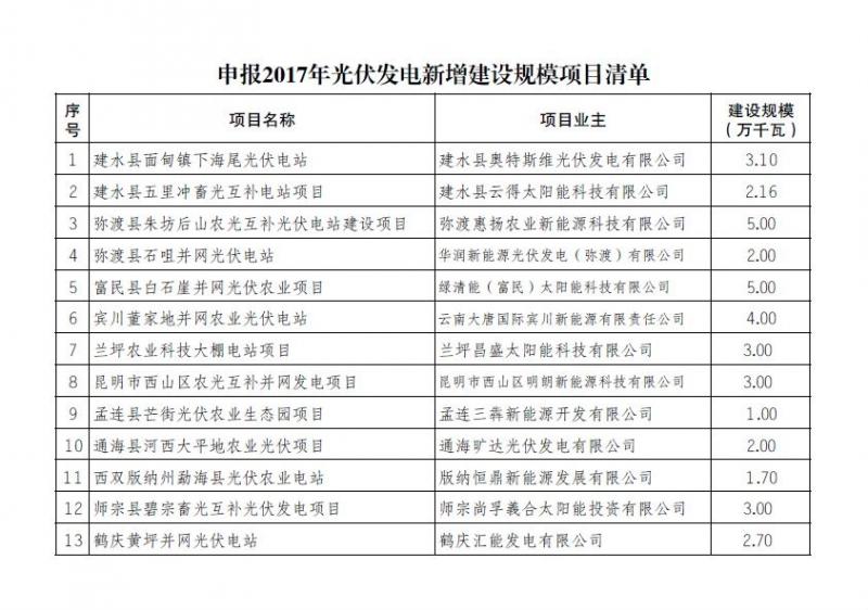 按照国家能源局对光伏发电新增建设规模分配新的工作要求,经请示国家能源局同意,现将各州(市)发展改革委员会(能源局)申报2017年光伏发电新增建设规模项目清单(详见附件)予以公示,并将有关事项通知如下: