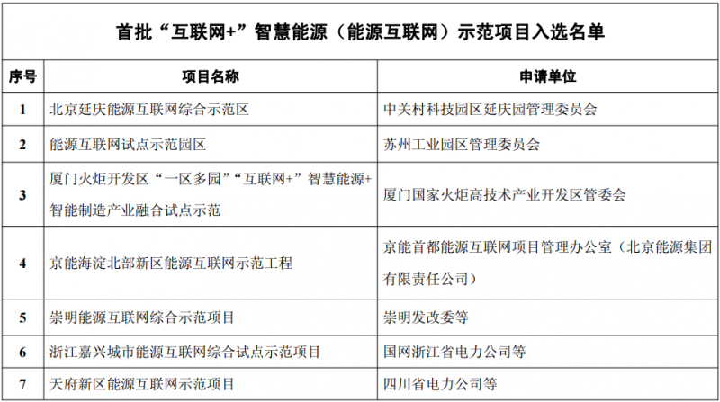 能源局:首批“互联网+”智慧能源(能源互联网)示范项目评选结果公示