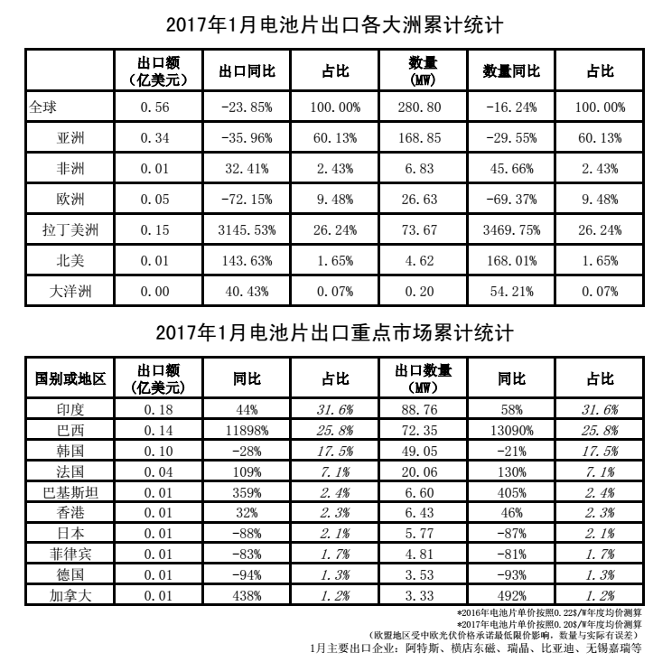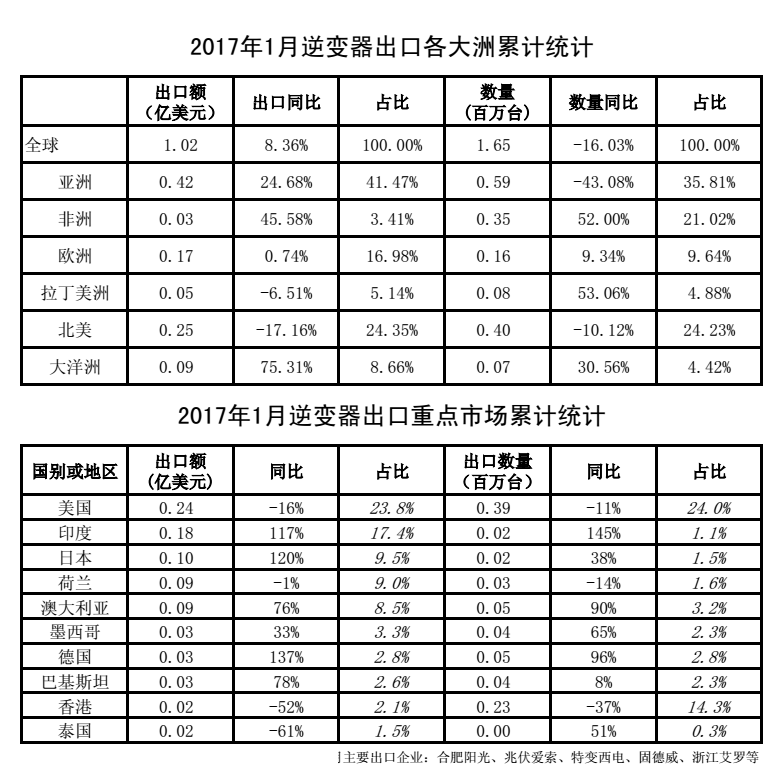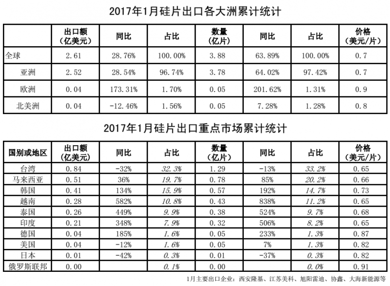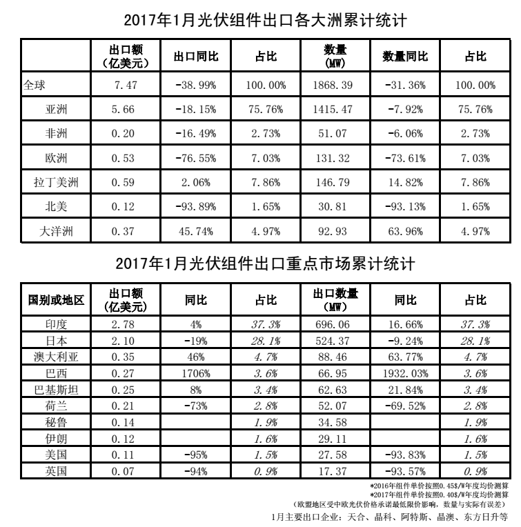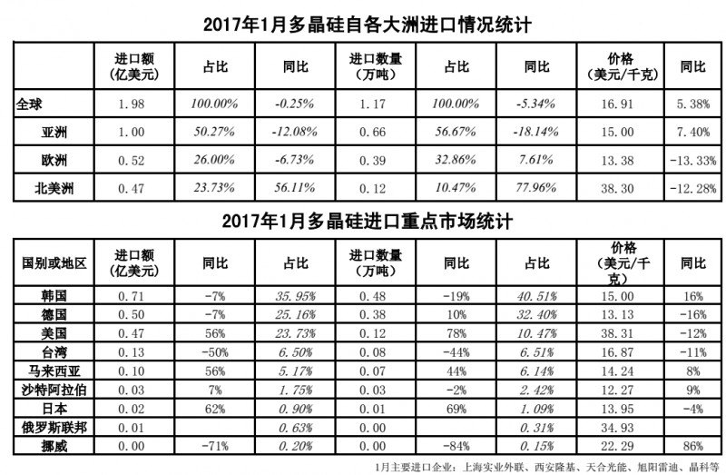 2017年1月我国光伏产品外贸统计数据(多晶硅、硅片、电池片、组件、逆变器)。