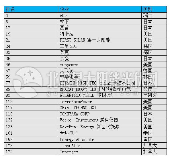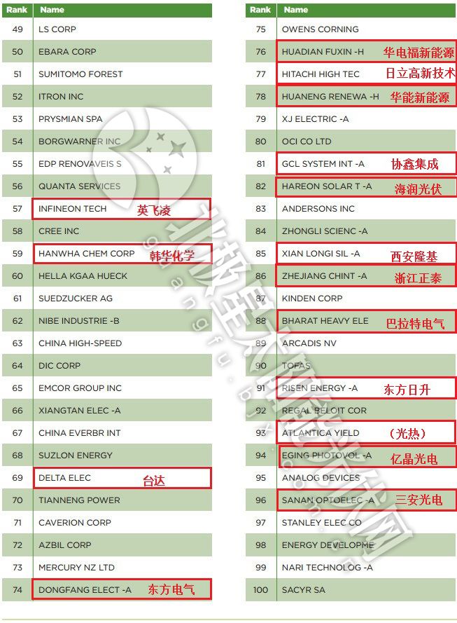 在可再生能源投资中,光伏发电由于近年来成本快速下降而受到更多企业的追逐。200强榜单光伏企业占据52个席位,其中中国光伏企业29家,最靠前的是朱共山领导的保利协鑫,排名第23位。