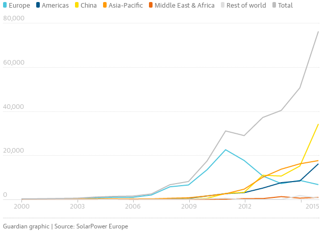 索比光伏网讯:在阳光充裕的地区,太阳能被视为最易安装和获取的绿色能源。当前全球光伏发电板总装量已达305吉瓦左右,而在2010年的时候,这一数字还仅为50吉瓦。《卫报》的报道称,中美两国主导着该领域的发展,在2016年的增速都较2015年几乎翻番;同期全球增量仅为80GW,2015增量仅为50GW。随着各国政府对气候变化忧虑的增长,太阳能产业也迎来了强势的增长。
