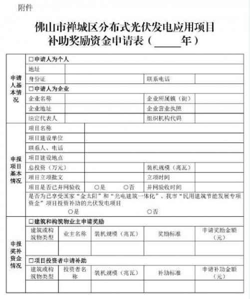 1.佛山市禅城区分布式光伏发电应用项目补助奖励资金申请表(见附件)