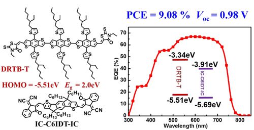 中国科学院化学研究所高分子物理与化学实验室侯剑辉课题组研究人员设计合成了以三个二维烷基噻吩取代的BDT为中心单元,3-乙基罗丹宁为端基的A-D-A小分子,DRTB-T(见下图)。DRTB-T的光学带隙为2.0eV,HOMO能级为-5.51eV。以DRTB-T为给体,IC-C6IDT-IC为受体制备了非富勒烯小分子太阳能电池,并通过溶剂退火的方法对其形貌进行调控,最终获得了9.08%的能量转换效率,这是目前报道的非富勒烯小分子太阳能电池的最高效率,这项研究最近发表在《美国化学会志》(J.Am.Chem.Soc.2017,139,1958-1966)。