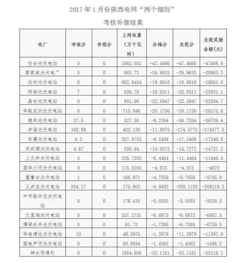 原标题:2017年1月份陕西电网“两个细则”考核补偿情况